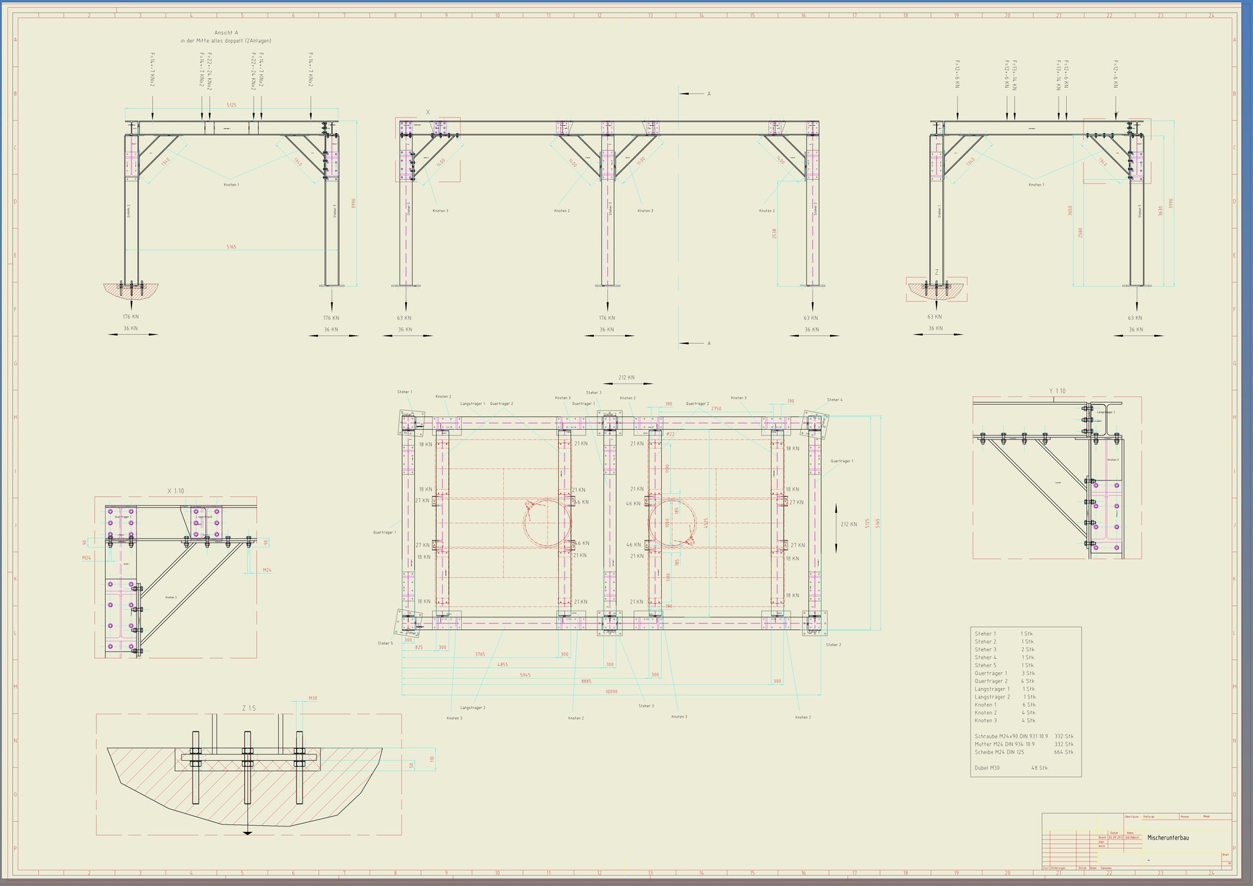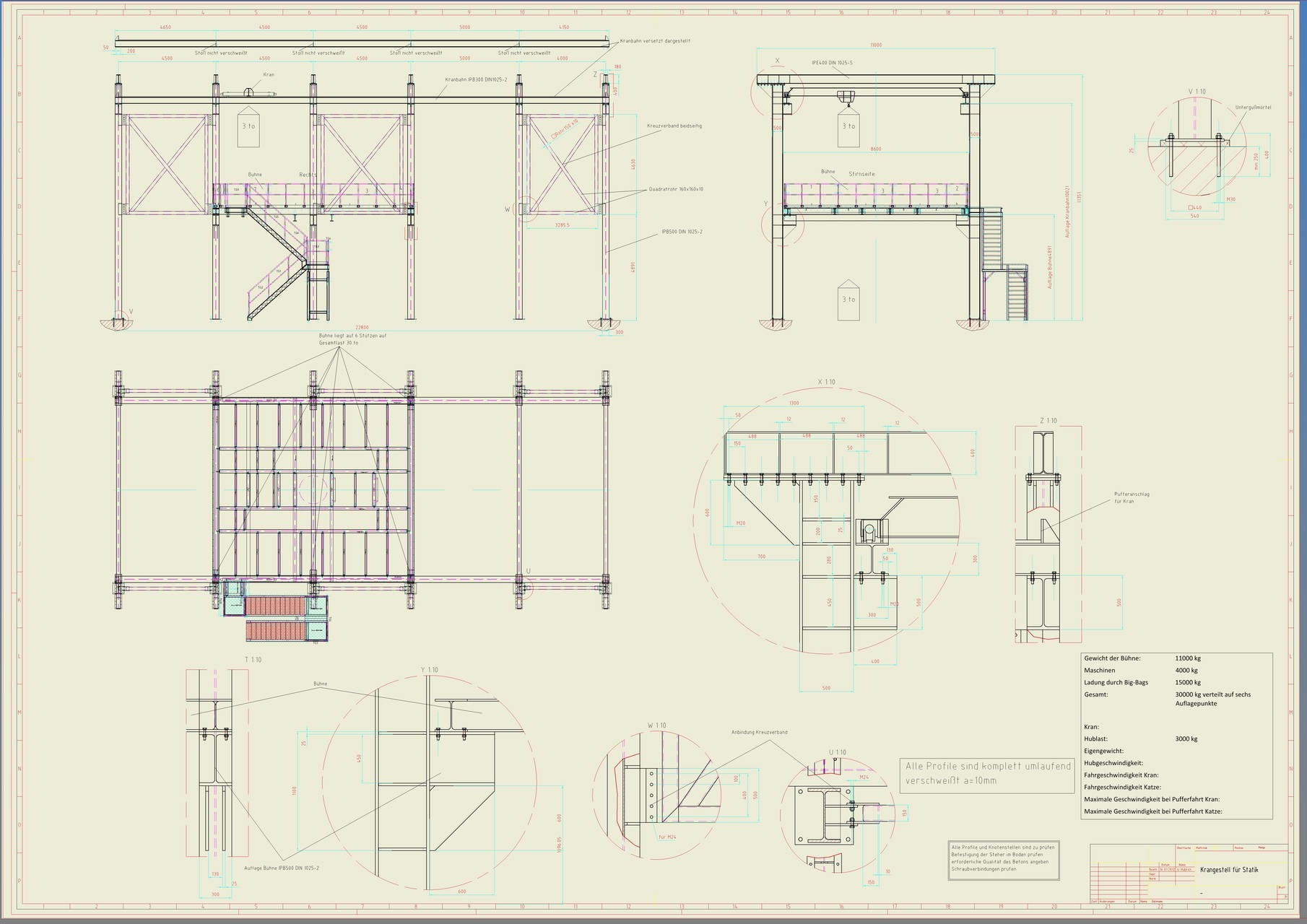 Konstruktion für den Bereich Stahlbau. Neu- und Anpassungskonstruktion ggf. mit Vorbereitung zur Prüfung duch Statiker in 2D und 3D mit AutoCAD und Inventor. Stücklistenerstellung in Absprache.