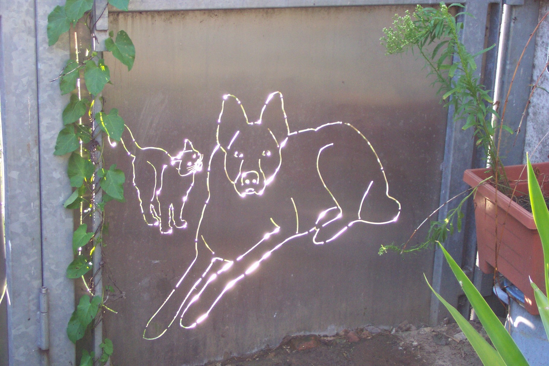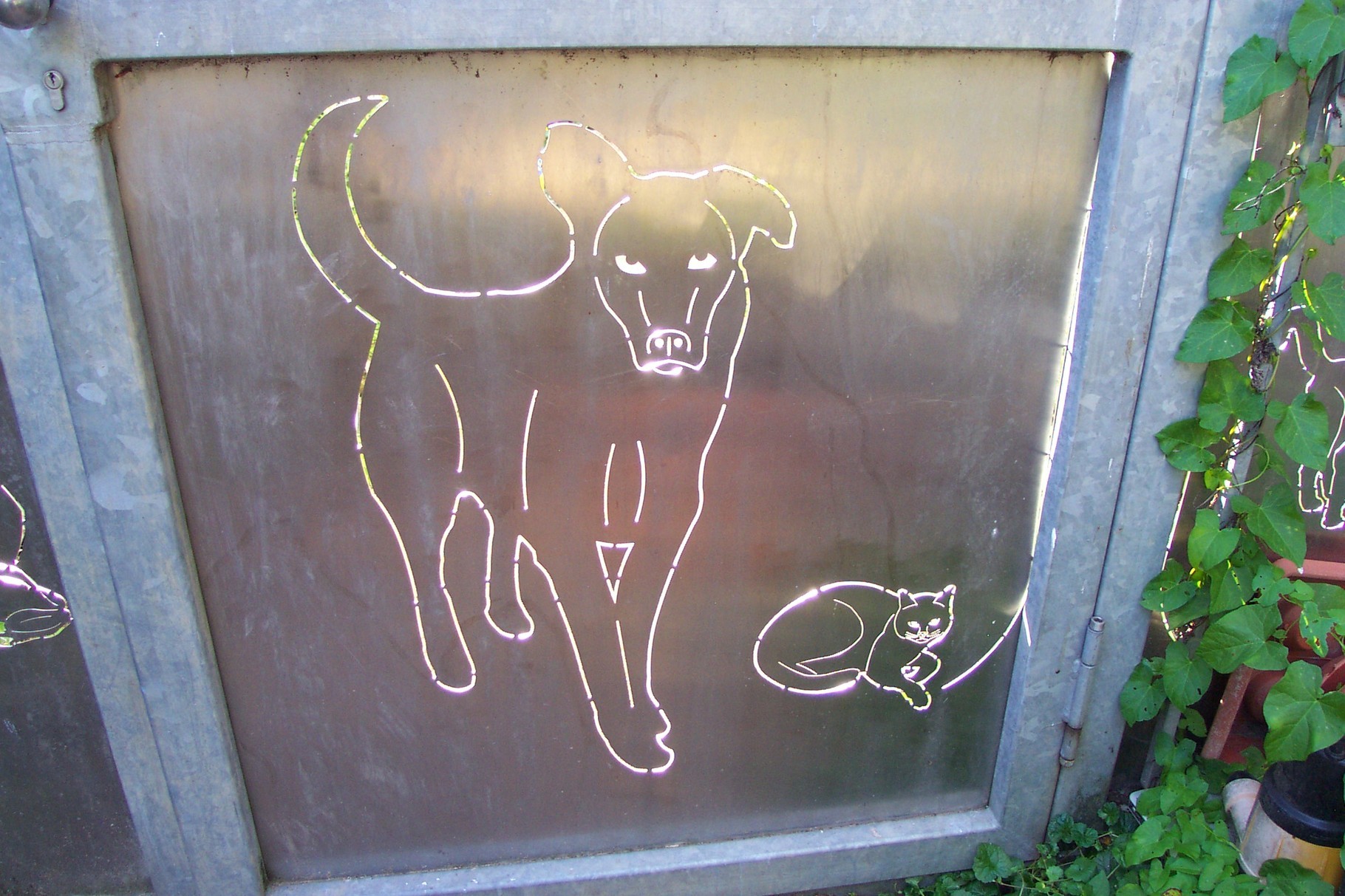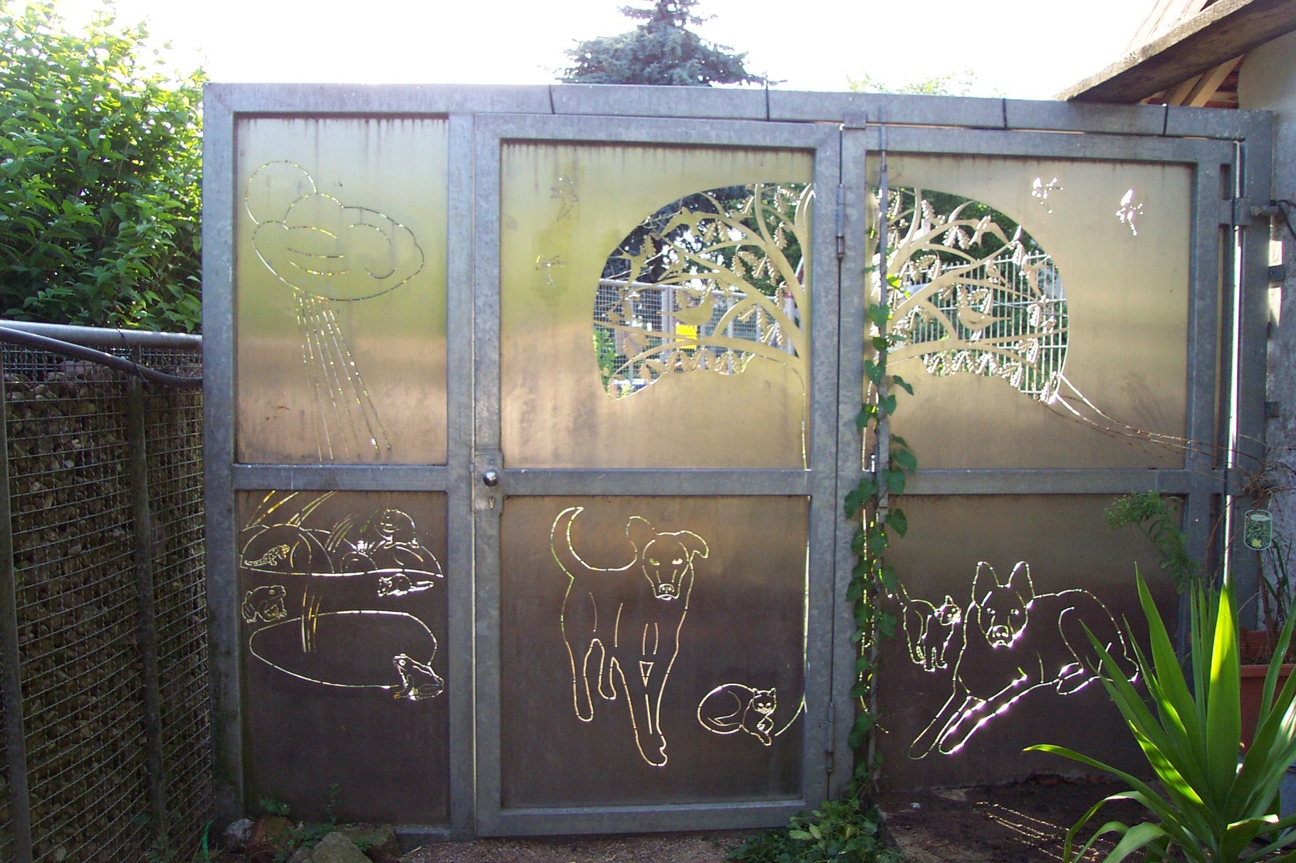 Nach Fotovorlagen können Abbilder von Ihrem persönlichen Tier zum Beispiel für ein Tor, Tür, Schild, Zaun oder Grabstätte hergestellt und angepaßt werden. Je nach Aufstellung im Innen oder Außenbereich können diese aus verschiedenen Materialien wie Holz, Stahl, Edelstahl, Kunststoff (Stein auf Anfrage) oder einer Kombination daraus hergestellt werden. Es handelt sich dabei um geschnittene Platten mit Ihren Motiven, die dann an einem Untergrund zum Beispiel einem Torrahmen befestigt werden können.